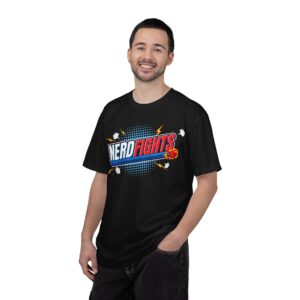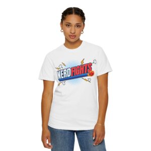 This heavyweight, garment-dyed tee brings playful, retro energy to casual weekends and game-night lineups. The bold “NERD FIGHTS” emblem—rendered in comic-book colors with action streaks and a tiny exploding planet—reads like a badge of friendly rivalry. It wears in softly thanks to post-construction dyeing and ring-spun cotton, so the print pops while the fabric feels broken-in from day one. Throw it on for tabletop sessions, podcast recordings, or long walks through the convention floor; it’s built to stand up to repeated wear and still look lived-in and loved.